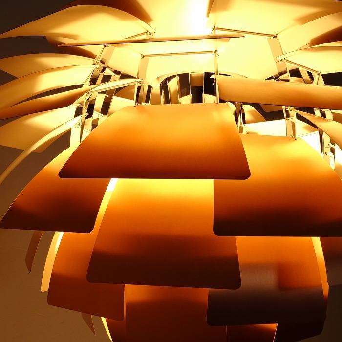 アーティチョークの名前を象徴している、12列に6枚づつ正確に配置された72枚の羽根は、それぞれの羽根の内側が光を反射して下のシェードを照らし、器具全体が美しく発光して心地よい照明となります。